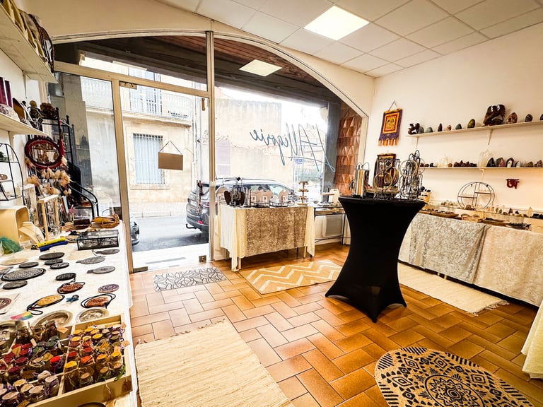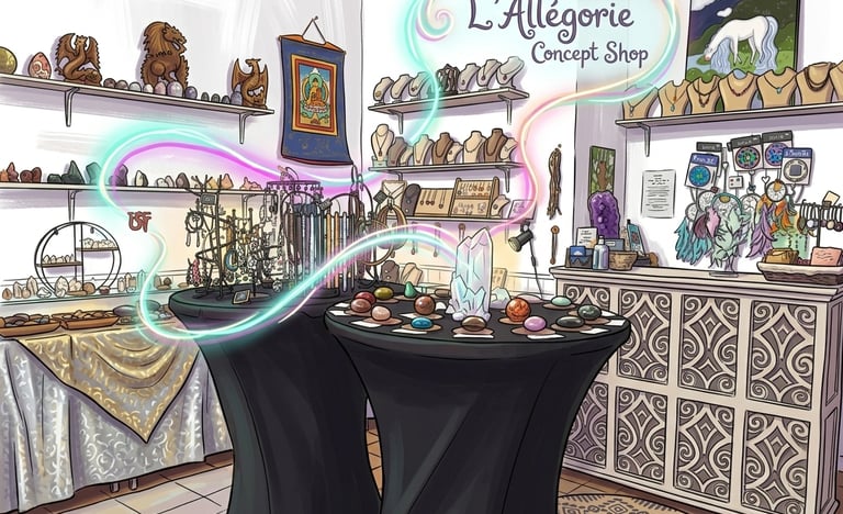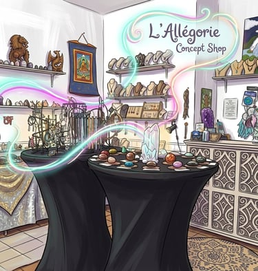 La boutique l'Allégorie Concept Shop est un show room proposant un grand choix de minéraux avec des pièces uniques, des produits bien-être, des encens, des outils énergétiques et des créations artisanales personnalisées et originales de bijoux en pierres fines.